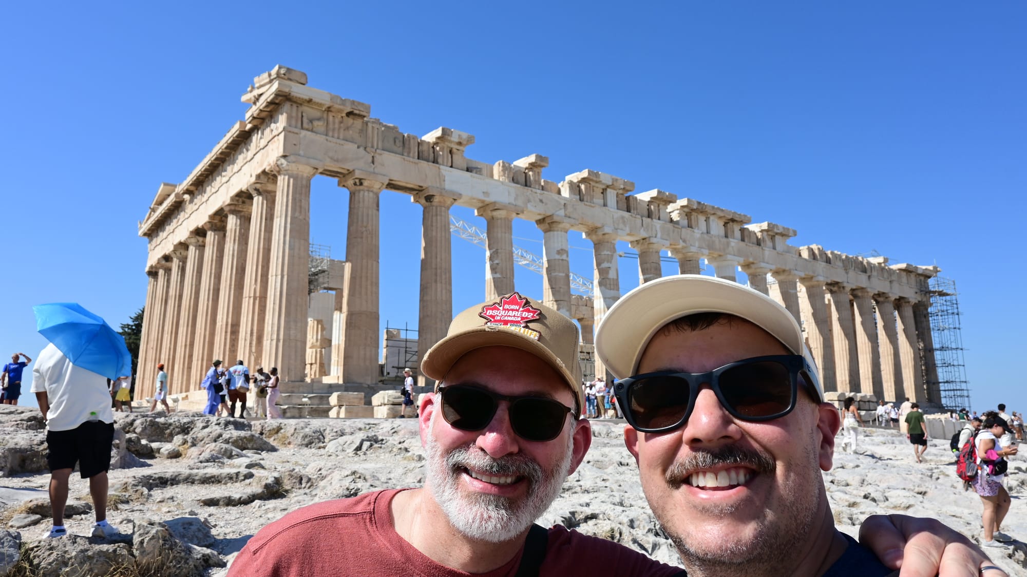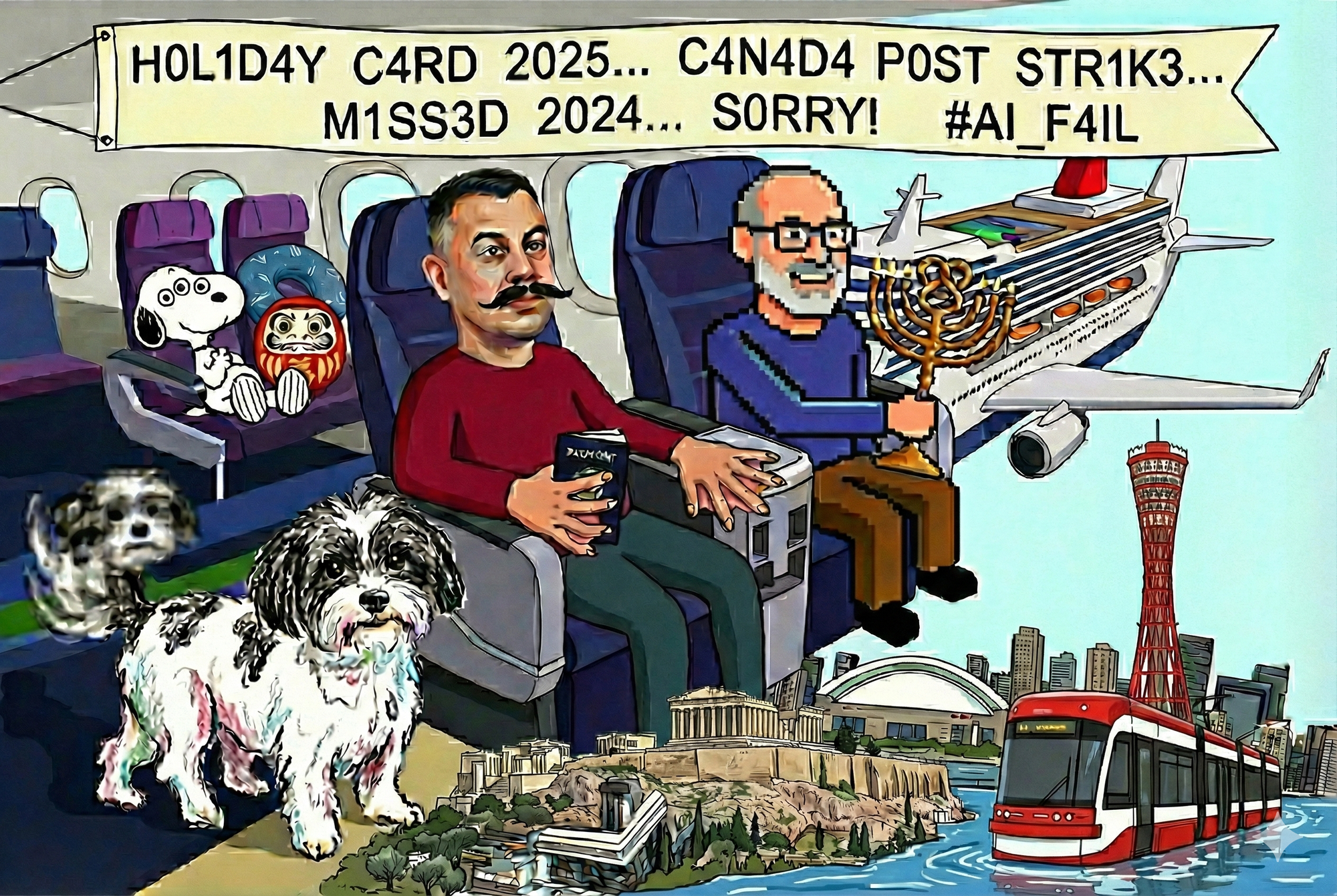 This card highlights our love of travel, that we live in Toronto and of course Suica. But we also went to Greece and up the Kobe Tower. So we asked AI to add in those elements. We also told it to draw on early AI which meant, wrong finger count, too many legs, animals melding into one and of course just other strange irregularities.